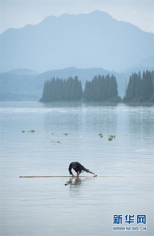 7月11日,方恕云在毛竹上表演难度动作。 54岁的浙江建德农民方恕云,自少年时就开始练习站在一根毛竹上渡江的绝技,还能做俯卧撑、抬脚跳等动作,在水中“如履平地”。 新华社记者 翁忻旸 摄