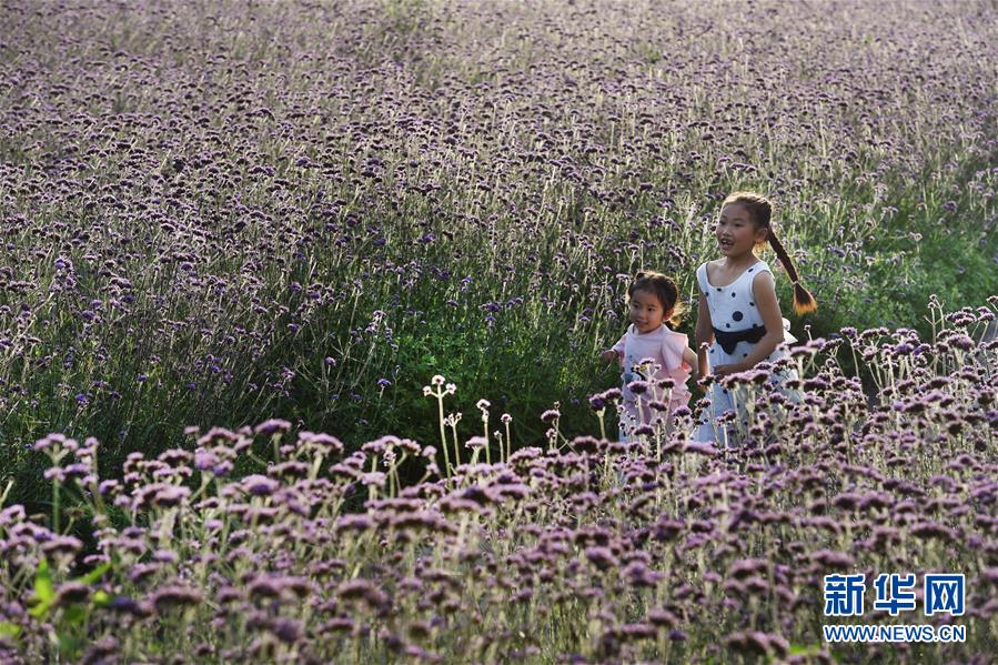 7月12日,两名小女孩在留坝县城的金水湾花海游玩。 近日,在陕西省汉中市留坝县金水湾花海,醉蝶花、马鞭草等各类鲜花次第绽放,令人赏心悦目。 新华社记者 陶明 摄