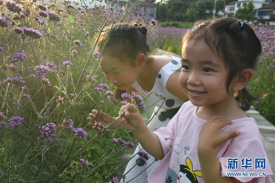 7月12日,两名小女孩在留坝县城的金水湾花海游玩。 近日,在陕西省汉中市留坝县金水湾花海,醉蝶花、马鞭草等各类鲜花次第绽放,令人赏心悦目。 新华社记者 陶明 摄