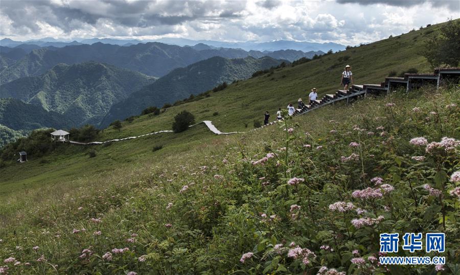 7月12日,游人在留坝县紫柏山风景区游览。 陕西紫柏山国家森林公园位于留坝县境内,因山上古树多紫柏而得名。七月的紫柏山,处处山花烂漫,一步一景,一望无边的高山草甸与变幻无穷的蓝天白云相映成趣,成为游人消夏的好去处。 新华社记者 陶明 摄