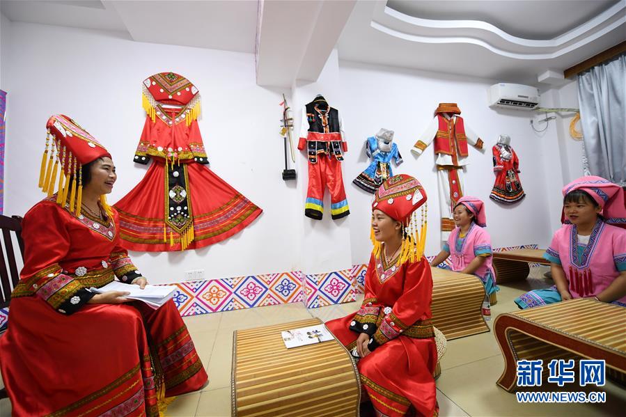 7月11日晚,在广西柳州市鱼峰区羊角山社区,刘日红(左二)跟着师父陆连芳练习唱山歌。新华社发(黎寒池摄)