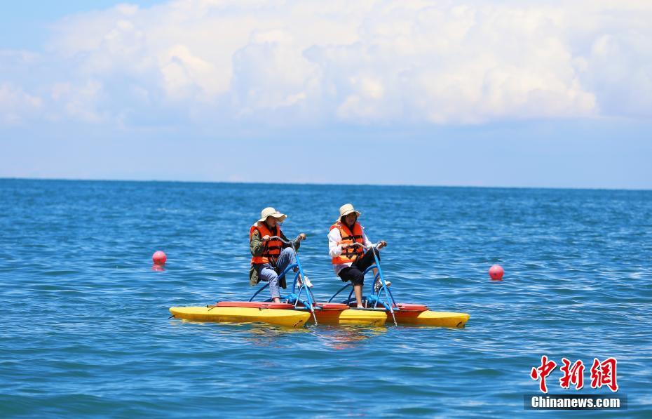 7月12日,天蓝水清的青海湖景区吸引游客赏景游玩。图为游客体验水上娱乐项目。中新社记者 马铭言 摄