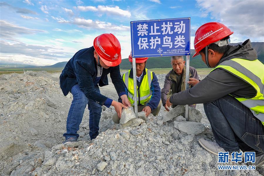 在新疆哈密东天山草原,工程建设者在工地旁设立“保护鸟类”的提示牌(6月23日摄)。 新华社发(李华 摄)
