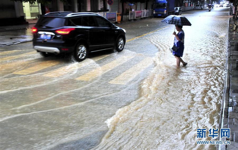 7月13日,在广西罗城县解放路一积水区域,人们涉水出行。 当日,广西河池市罗城仫佬族自治县降下暴雨,城区多条街道积水严重,变成“河道”。 新华社发(吴耀荣摄)