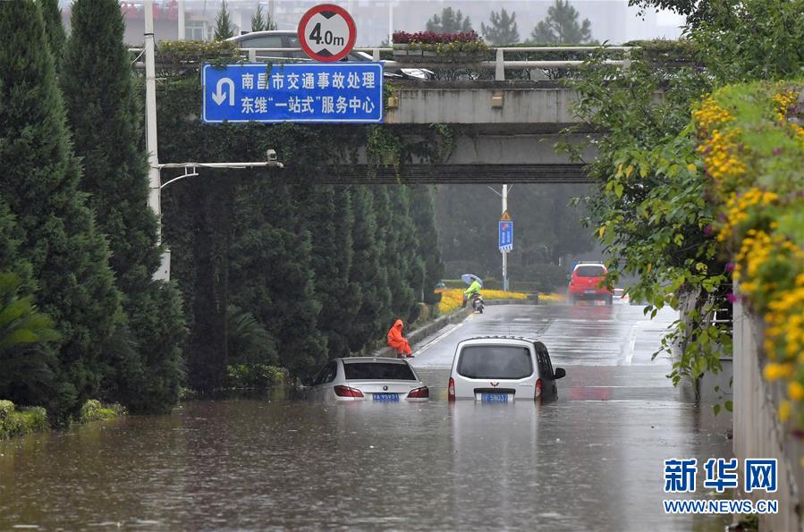 7月13日,在江西省南昌市红谷滩新区一处路段,两辆汽车被困积水中。 当日,江西省南昌市遭遇强降雨。 新华社记者 彭昭之 摄