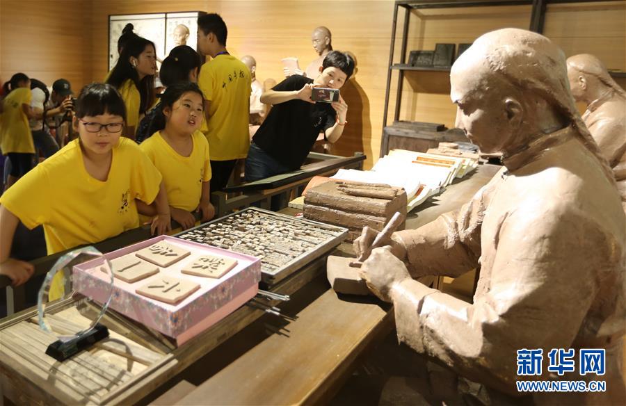 7月13日,华裔青少年在浙江瑞安东源木活字印刷展示馆参观体验。新华社发(庄颖昶摄)