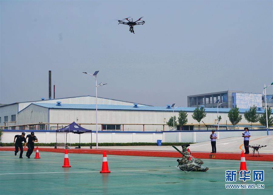 7月13日,公安干警进行警用无人机网枪抓捕犯罪嫌疑人演练。 当日,由公安部警用航空管理办公室组织、中国人民公安大学无人机应用培训考试中心承办,廊坊市公安局协办的全国警用无人机教官考官培训班举行结业仪式,并进行多个警用无人机警务实战科目演练。 新华社记者 邢广利 摄