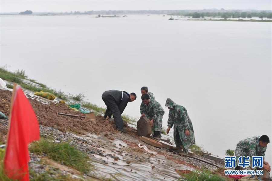 7月13日,余干县江埠乡的干部和群众在圩堤上查找、填补渗水的洞口。 受连续强降雨影响,鄱阳湖水位持续上涨,全面超警戒线。其中,江西省上饶市余干县江埠乡中洲村圩堤多处出现管涌、渗漏等险情。当地乡镇干部带领群众投入抗洪抢险。 新华社记者 胡晨欢 摄