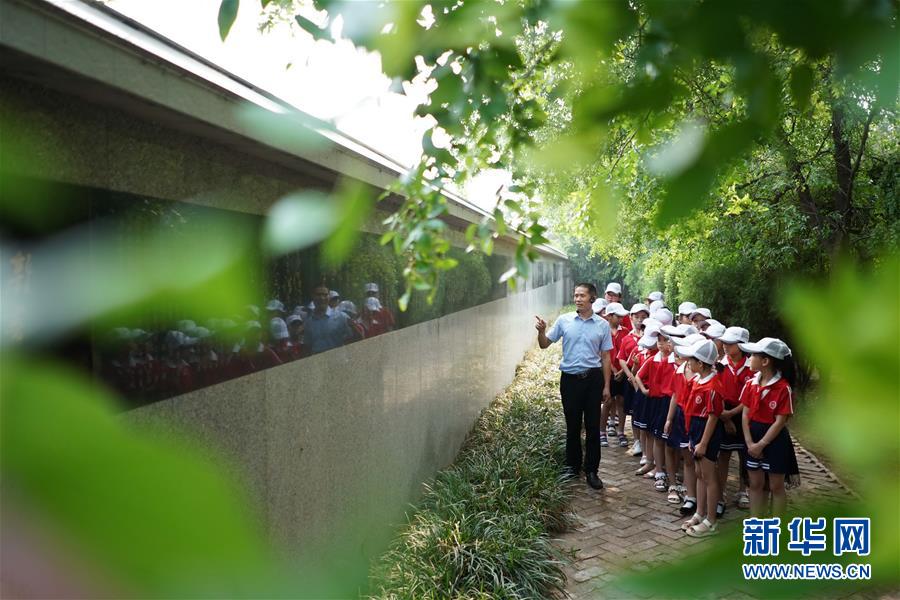 7月13日,讲解员在爱华翰苑碑林为前来参观的巨鹿县育新小学学生讲解。 当日,河北省邢台市巨鹿县育新小学组织学生前往位于该县县城的邢台市爱国主义教育基地——爱华翰苑碑林,听讲解员讲解碑上镌刻的热爱祖国、热爱家乡等历代名言警句,过一个有意义的暑假。 新华社记者 牟宇 摄