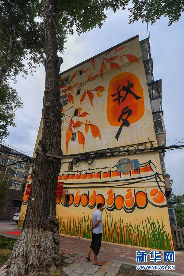 7月13日,市民从长春市南湖中街一幢画有楼体彩绘的居民楼前走过。 近日,吉林省长春市南湖中街两侧,三十余幅楼体彩绘亮相,吸引过往市民驻足观看。据了解,这些楼体彩绘是长春市文化街区打造工程的一部分,为附近居民的生活环境增添了一道靓丽风景线。 新华社记者 张楠 摄