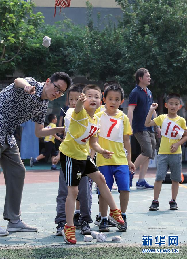 7月13日,孩子们在进行扔沙包比赛。新华社记者 殷刚 摄