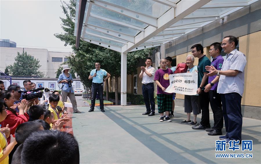 7月13日,参加趣味运动会的孩子和家长为首都儿科研究所陈育智教授(右四)庆祝85岁生日。新华社记者 殷刚 摄