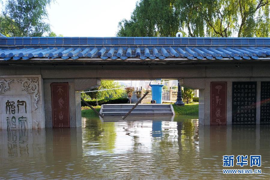 7月13日,黄河兰州段沿岸的兰州龙源公园部分设施被淹没(无人机拍摄)。 新华社记者 范培珅 摄