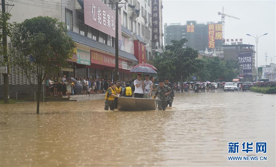 7月13日,广西永福突降暴雨,造成永福火车南站附近道路积水严重,人武部门出动救援船只搭送旅客前往车站。 记者从广西壮族自治区气象局了解到,7月12日20时开始,强降雨影响桂北地区,雨势猛烈,桂北大部出现暴雨,局部大暴雨或特大暴雨,桂林永福县2万多人受灾。 据永福县防汛抗旱指挥部发布数据,从12日20时至13日17时,永福县9个站点中有6个站点雨量超过100毫米,最大为罗锦镇站点,降雨量达352毫米。 新华社记者 杨驰 摄