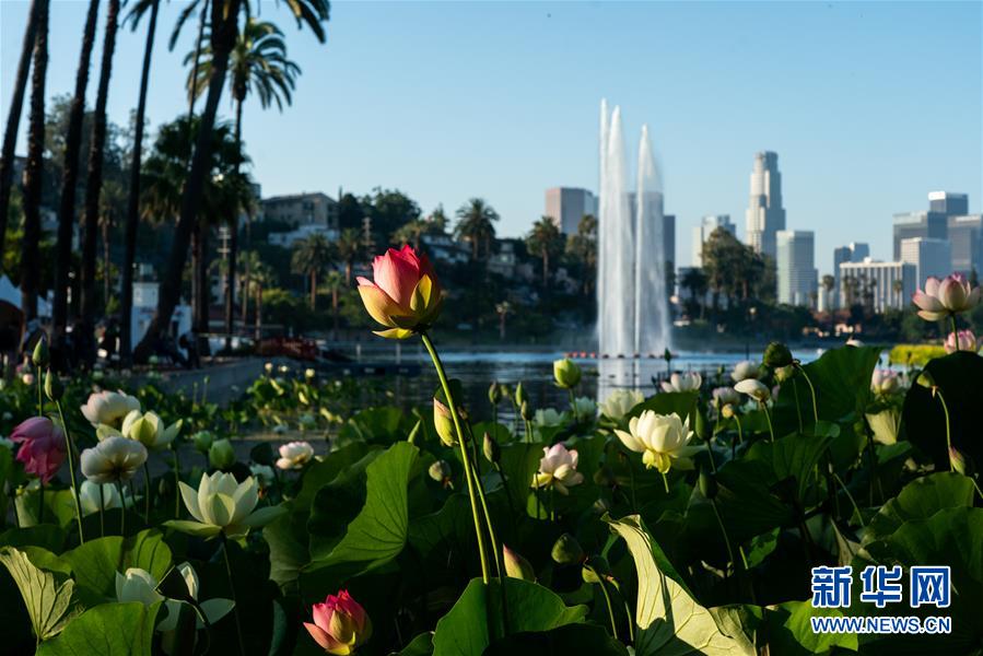 这是7月13日在美国洛杉矶荷花节上拍摄的荷花。 当日,第39届洛杉矶荷花节在回声公园举行,成片的荷花吸引众多市民前往观赏。 新华社发(钱卫忠摄)