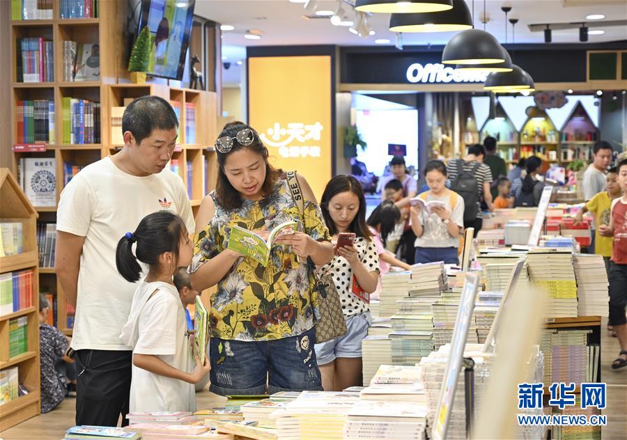 7月14日,在重庆书城,一名小女孩在父母的陪伴下选购心仪的图书。 正值暑期长假,不少小朋友在家长的陪伴下来到书店阅读、学习,在浓浓书香中度过充实、快乐的假期。 新华社记者 刘潺 摄