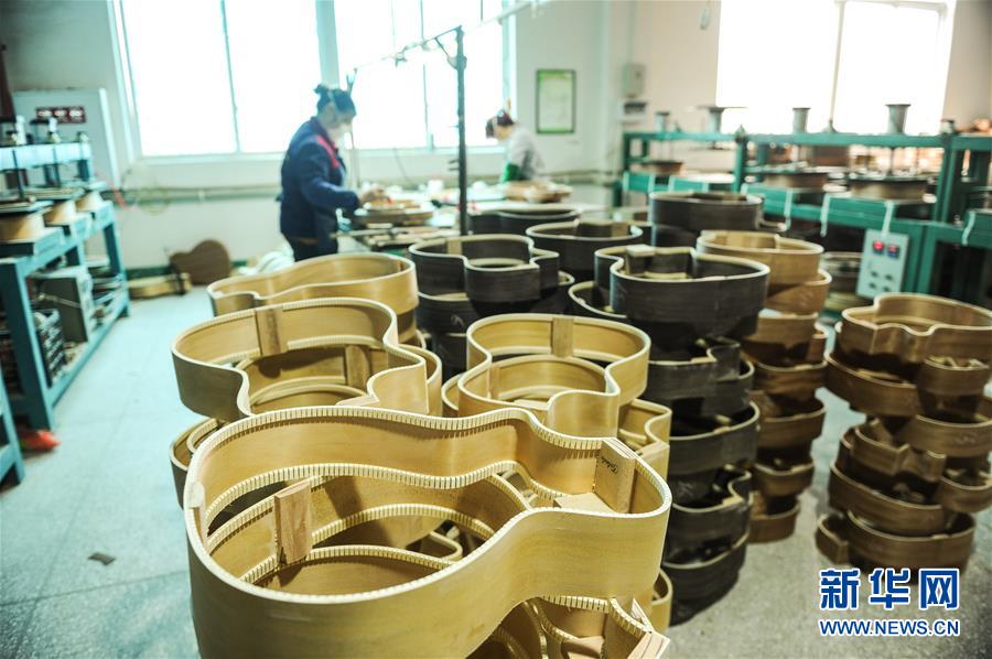 工人在贵州省正安县“正安·国际吉他产业园”的一处吉他装配车间工作(2017年3月28日摄)。新华社记者 陶亮 摄