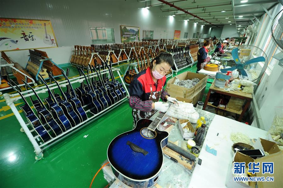 贵州省正安县“正安·国际吉他产业园”的工人在制作吉他(2018年3月31日摄)。 新华社记者 杨文斌 摄
