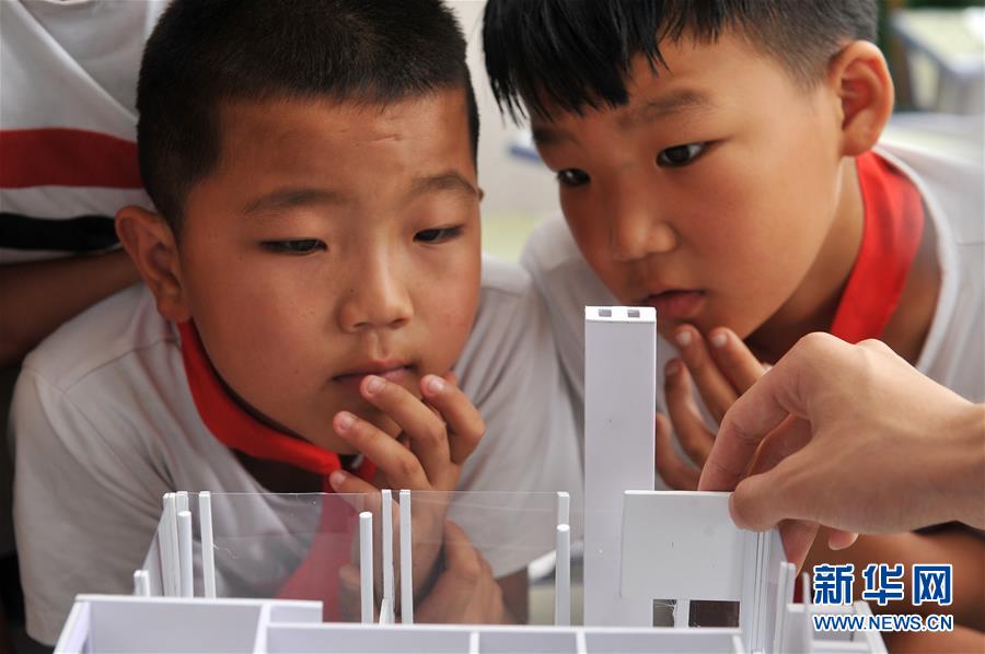 7月14日,海兴县常丰中心小学学生在观看志愿者带来的建筑模型。 新华社记者 牟宇 摄