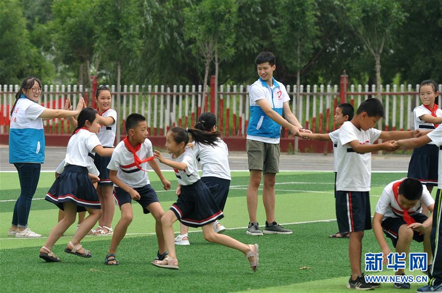 7月14日,志愿者与海兴县常丰中心小学学生在一起做游戏。新华社记者 牟宇 摄