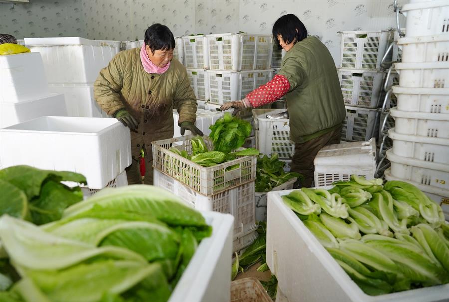 新华社照片,西安,2019年7月14日 陕西:太白山下种蔬菜 质优价高不愁卖 太白县绿蕾农业专业合作社的工人在冷库中打包蔬菜(7月11日摄)。 (配本社同题文字稿) 新华社记者 邵瑞 摄