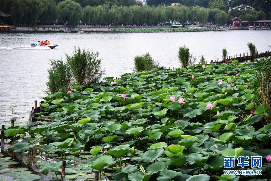 7月14日,游客在大明湖乘坐快艇经过一片荷花池。新华社记者 王凯 摄