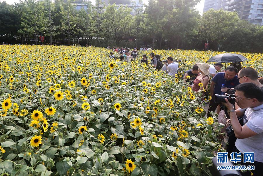 7月14日,游客在上海南园滨江绿地拍照、赏花。新华社记者 陈飞 摄