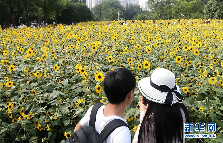 7月14日,游客在上海南园滨江绿地观赏盛开的向日葵。新华社记者 陈飞 摄