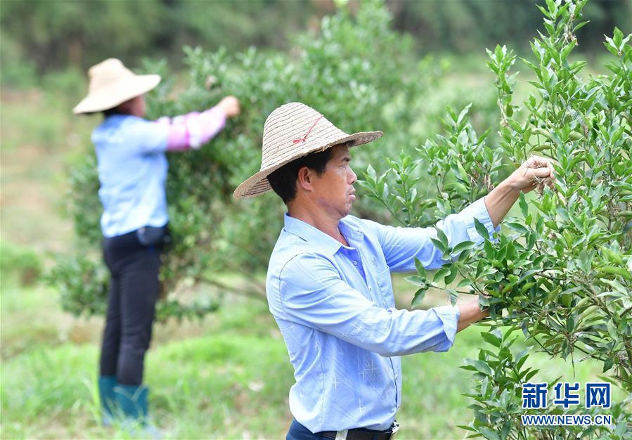 7月14日,在广西柳州市融安县板榄镇四平村,群众正在清理被洪水浸泡的金桔树上的杂物,准备进行消毒。 连日来,受强降雨影响,广西柳州市融安县部分地区出现严重洪涝灾害,致农作物受灾面积1097.79公顷,近万人受灾。目前,当地党委政府组织党员干部和受灾群众开展生产自救和灾后恢复工作。 新华社记者 黄孝邦 摄