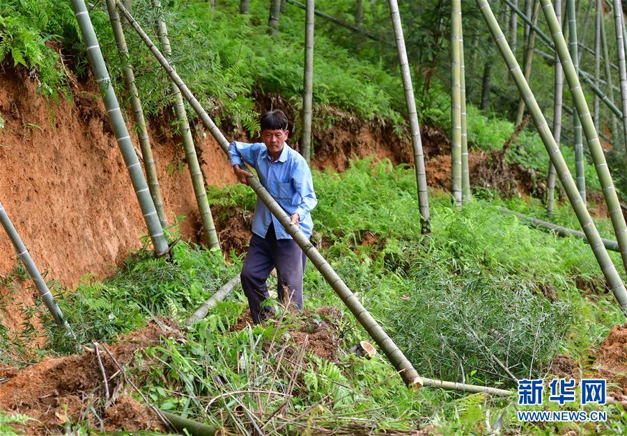 7月14日,在广西柳州市融安县板榄镇江北村,群众在清理因山体滑坡而倒下的竹子。 连日来,受强降雨影响,广西柳州市融安县部分地区出现严重洪涝灾害,致农作物受灾面积1097.79公顷,近万人受灾。目前,当地党委政府组织党员干部和受灾群众开展生产自救和灾后恢复工作。 新华社记者 黄孝邦 摄