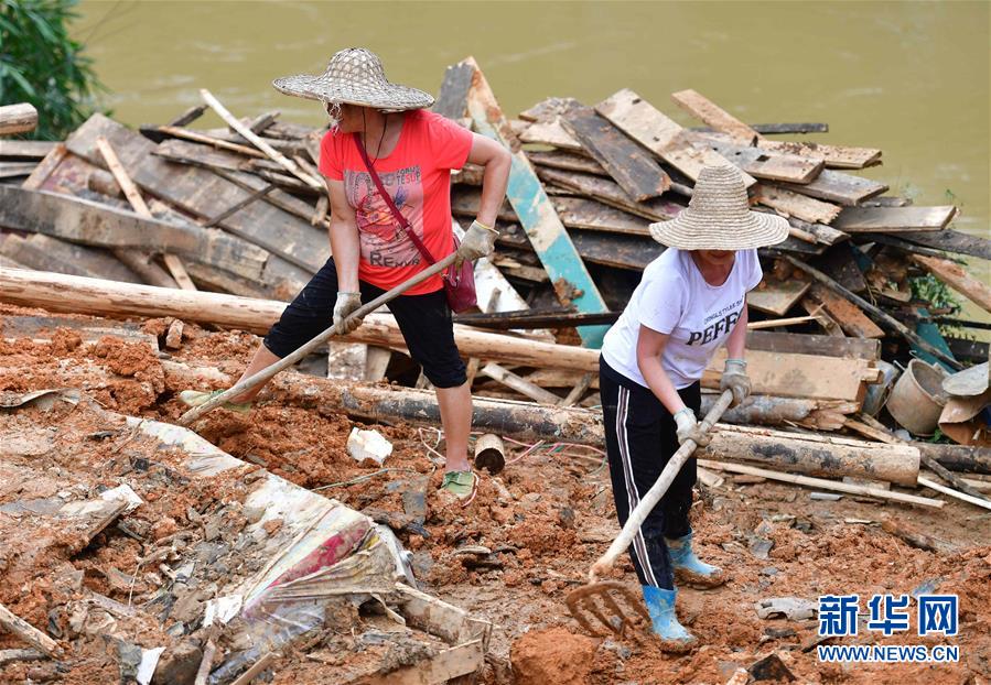 7月14日,在广西柳州市融安县板榄镇江北村,群众在维修被洪水损坏的房屋。 连日来,受强降雨影响,广西柳州市融安县部分地区出现严重洪涝灾害,致农作物受灾面积1097.79公顷,近万人受灾。目前,当地党委政府组织党员干部和受灾群众开展生产自救和灾后恢复工作。 新华社记者 黄孝邦 摄