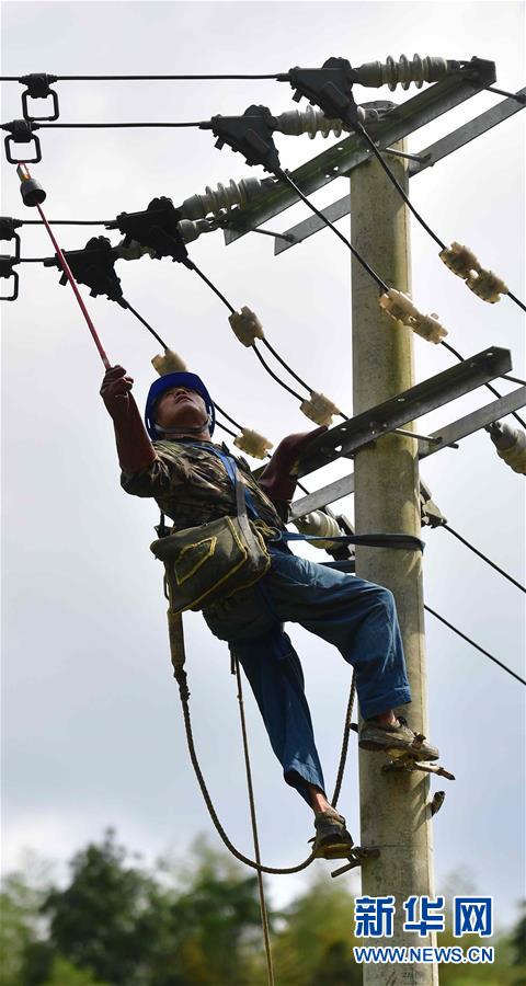 7月14日,在广西柳州市融安县雅瑶乡大琴村,供电局抢修人员在维修线路。 连日来,受强降雨影响,广西柳州市融安县部分地区出现严重洪涝灾害,致农作物受灾面积1097.79公顷,近万人受灾。目前,当地党委政府组织党员干部和受灾群众开展生产自救和灾后恢复工作。 新华社记者 黄孝邦 摄