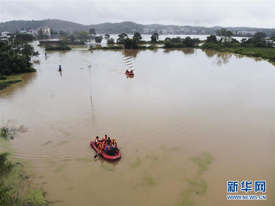 7月14日,湖南省永州市零陵区富家桥镇渔池头村发生洪涝灾害,有关部门迅速展开救援。这是救援人员在用皮划艇转移受困群众(无人机拍摄)。 新华社发(陈思汗 摄)