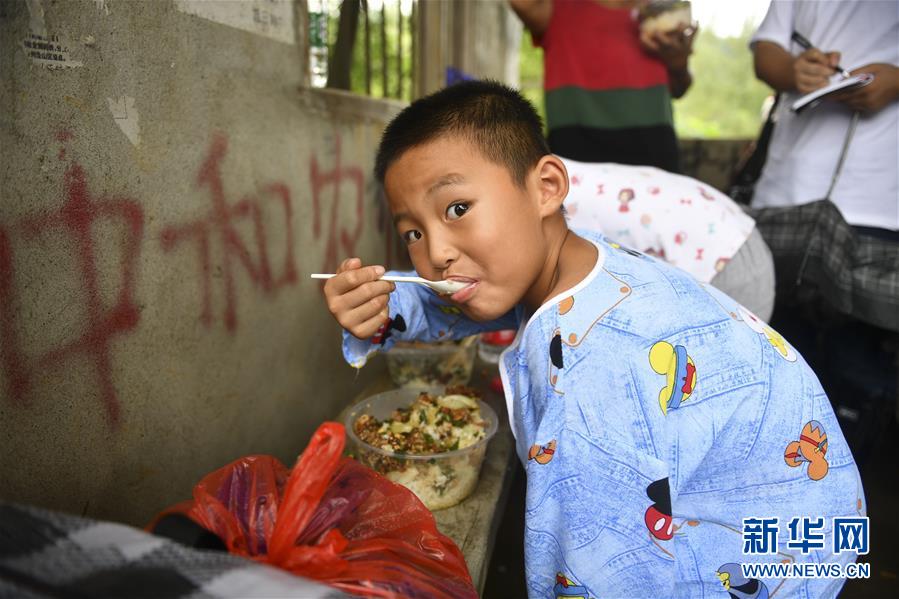 7月14日,在湖南省永州市零陵区富家桥镇渔池头村,受困的孩子被转移到安全地点后吃上了热腾腾的饭菜。新华社发(陈思汗 摄)