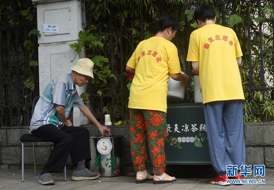 7月14日,来自长明寺巷社区的志愿者与顾忠根(左)一起照看免费凉茶摊。 日前,位于杭州市上城区小营街道长明寺巷社区的顾大伯凉茶摊正式开张,在炎炎夏日中为过往路人免费提供凉茶。这个免费凉茶摊位于公交站旁,到今年已坚持了42年。 顾大伯名叫顾忠根,今年81岁。由于顾大伯年岁渐长,来自街道、社区、高校的众多志愿者纷纷加入志愿服务公益活动,轮流帮助顾大伯照看这个免费凉茶摊,让爱心接力。 新华社记者 韩传号 摄