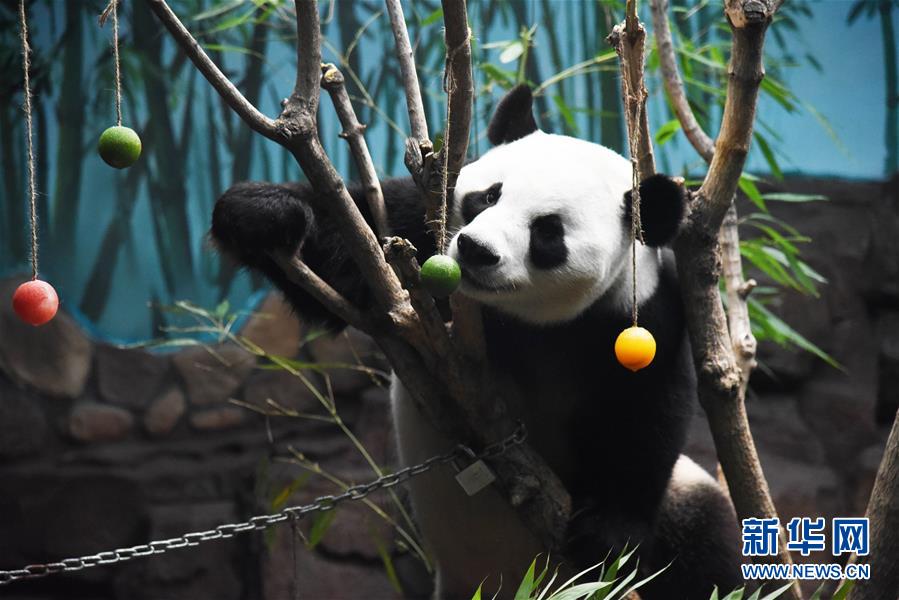 7月15日,济南野生动物世界的大熊猫“二喜”在享用园区工作人员为它准备的包裹着冰块的水果。新华社记者 王凯 摄