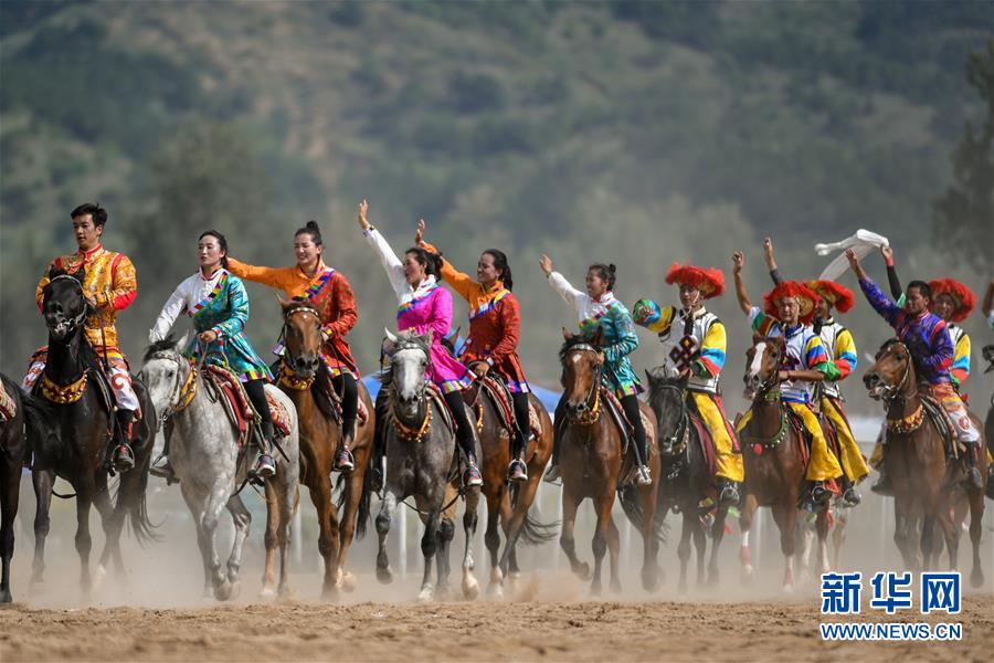 7月15日,西藏队骑手集体向观众致意。 当日,在内蒙古呼和浩特市举办的第十一届全国少数民族传统体育运动会马上项目进入第四个比赛日。 新华社记者彭源摄