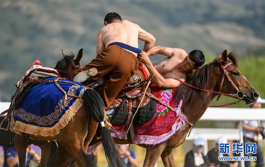 7月15日,新疆队骑手表演马上角力。 当日,在内蒙古呼和浩特市举办的第十一届全国少数民族传统体育运动会马上项目进入第四个比赛日。 新华社记者彭源摄