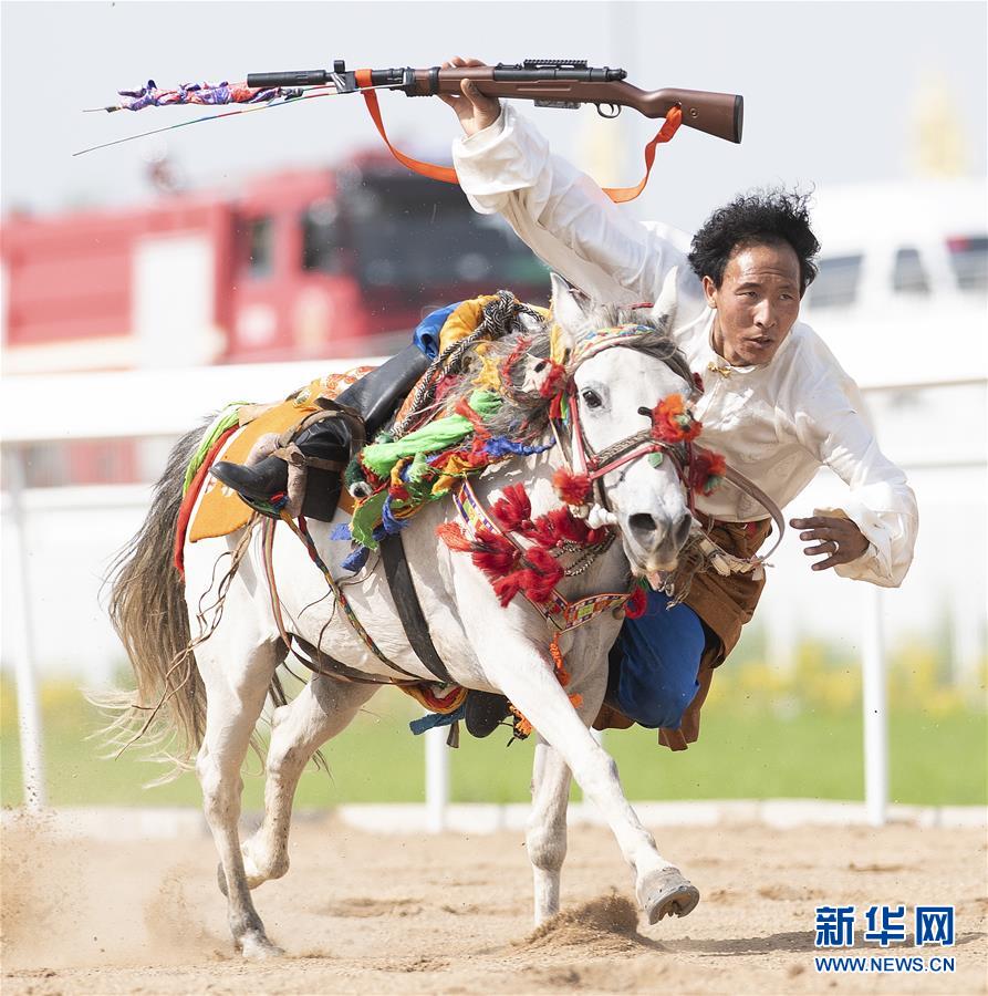 7月15日,青海代表团选手表演骑马点火。 当日,在内蒙古呼和浩特市举办的第十一届全国少数民族传统体育运动会马上项目进入第四个比赛日。 新华社记者沙达提摄