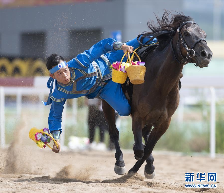 7月15日,内蒙古代表团选手表演马上技巧。 当日,在内蒙古呼和浩特市举办的第十一届全国少数民族传统体育运动会马上项目进入第四个比赛日。 新华社记者沙达提摄