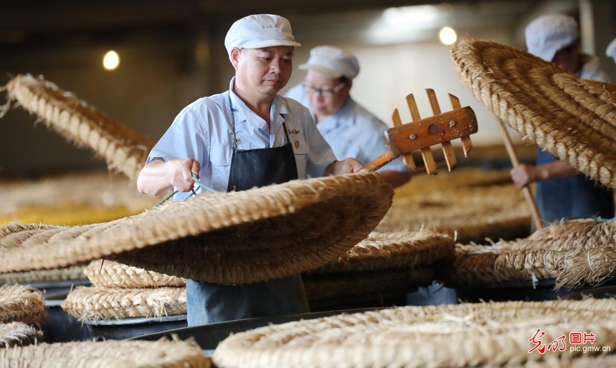 2019年7月15日,在浙江省湖州市德清县禹越镇,酿醋工人在古法酿醋车间内忙碌。这种传统古法酿醋技艺以当地优质大米、糯米、纯中药制作醋曲,经过蒸煮、酿晒、发酵等30余道工序制作而成。(谢尚国摄/光明图片)