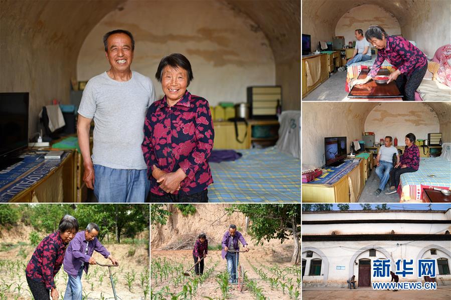 赵树江和妻子魏焕英,都是1949年出生,家在山西省长治市武乡县南垴村。老两口种了5亩玉米、1亩小米,还有核桃树。2016年,赵树江和魏焕英家的窑洞出现裂缝,他们申请进行了危房改造,经过修理后,家里的房子焕然一新。 左上:赵树江(左)和妻子魏焕英在家中合影;右上:魏焕英在打扫卫生;右中:赵树江(左)和妻子魏焕英在家里看电视;下右:魏焕英在院子里扫地;下左、下中:赵树江(右)和妻子魏焕英在地里忙碌(拼版照片,6月12日摄)。 地处晋东南的山西省长治市,位于由太行山、太岳山环绕而成的上党盆地中。在群山中、崖壁上,许多村庄自然条件恶劣,基础设施落后,脱贫致富是大山深处人们的迫切心愿。 近年来,一场场脱贫攻坚战,在一个个深山村打响。政府全力探索脱贫路径的同时,山区百姓因地制宜,靠自己的双手和智慧走上致富路,交出了一份扎实的脱贫答卷。 记者在太行山、太岳山一路寻访,记录下多位70岁老人的生活。这些共和国的同龄人,亲历了山乡的巨变,见证着长治山区脱贫攻坚伟大工程的一步步推进。 新华社记者 詹彦 摄