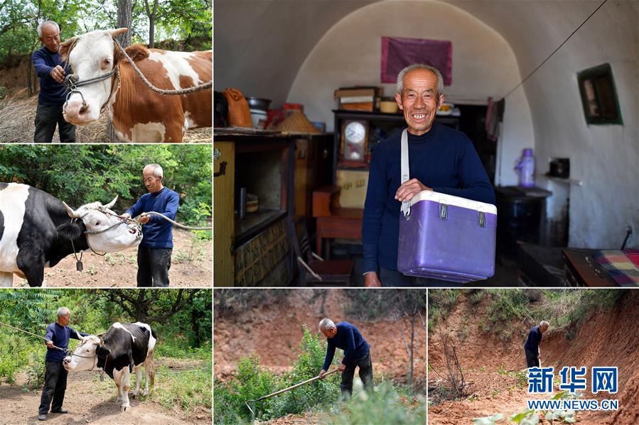 曹晋忠,男,1949年出生,山西省长治市武乡县铺上村人。曹晋忠是村里的动物防疫员,自己种了4亩玉米、2亩小米。因为妻子常年卧病在床,曹晋忠一家是该村的精准扶贫对象。曹晋忠说,医护人员经常上门进行健康状况随访,驻村工作队也常来家里帮忙,现在看病不发愁,干活有人帮,生活挺好的。 右上:曹晋忠肖像;左上、左中、左下:曹晋忠在给村里的牛做检查;下中、下右:曹晋忠在地里干农活(拼版照片,6月12日摄)。 地处晋东南的山西省长治市,位于由太行山、太岳山环绕而成的上党盆地中。在群山中、崖壁上,许多村庄自然条件恶劣,基础设施落后,脱贫致富是大山深处人们的迫切心愿。 近年来,一场场脱贫攻坚战,在一个个深山村打响。政府全力探索脱贫路径的同时,山区百姓因地制宜,靠自己的双手和智慧走上致富路,交出了一份扎实的脱贫答卷。 记者在太行山、太岳山一路寻访,记录下多位70岁老人的生活。这些共和国的同龄人,亲历了山乡的巨变,见证着长治山区脱贫攻坚伟大工程的一步步推进。 新华社记者 詹彦 摄