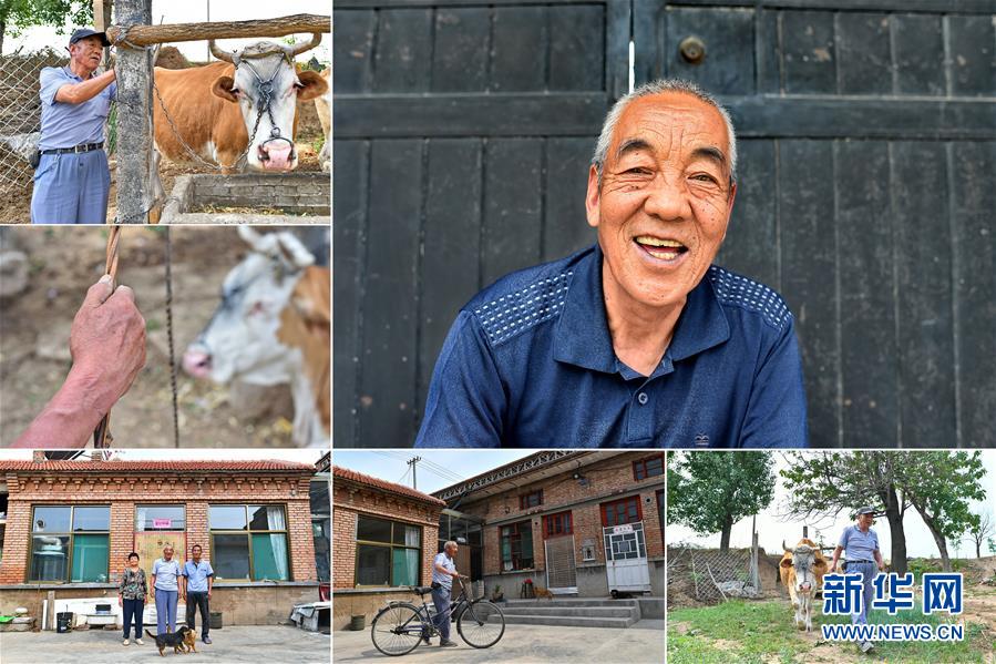 尚彩良,男,1949年出生,山西省长治市潞城区比干岭村人,家传的养殖技术让他从小不愁吃穿,但突如其来的患病导致他生活陷入困难。2015年开始,他享受贫困户养殖补贴、种植补贴和医疗补贴,2016年在当地政府的帮助下住进了新房。 右上:尚彩良肖像;左上:尚彩良准备去放牛;左中:尚彩良在放牛;左下:尚彩良(中)和家人在新院子里合影;下中:尚彩良推着自行车走进院子;下右:尚彩良在去放牛的路上(拼版照片,6月12日摄)。 地处晋东南的山西省长治市,位于由太行山、太岳山环绕而成的上党盆地中。在群山中、崖壁上,许多村庄自然条件恶劣,基础设施落后,脱贫致富是大山深处人们的迫切心愿。 近年来,一场场脱贫攻坚战,在一个个深山村打响。政府全力探索脱贫路径的同时,山区百姓因地制宜,靠自己的双手和智慧走上致富路,交出了一份扎实的脱贫答卷。 记者在太行山、太岳山一路寻访,记录下多位70岁老人的生活。这些共和国的同龄人,亲历了山乡的巨变,见证着长治山区脱贫攻坚伟大工程的一步步推进。 新华社记者 曹阳 摄