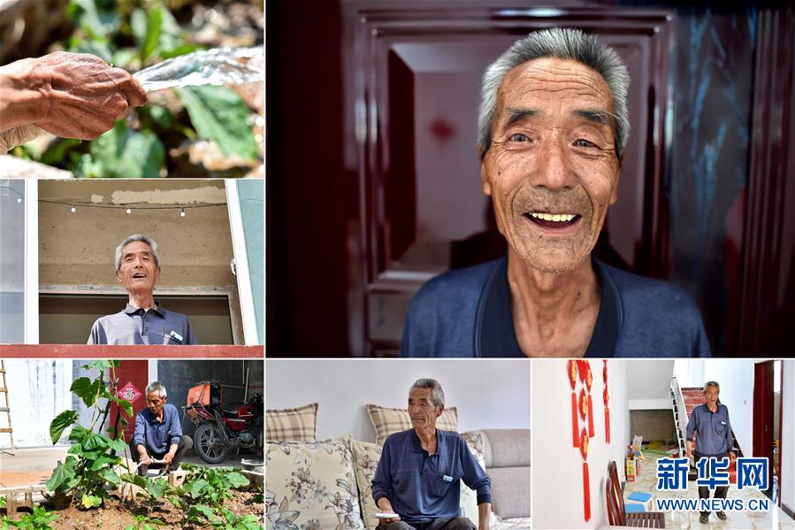 刘中秀,男,1949年出生,山西省长治市潞城区西北村人,全家5口人靠种植玉米为生,收入微薄。2011年,刘中秀因一次意外而致残,生活更加贫困。被列入建档立卡贫困户后,刘中秀在村干部的帮助下开起了农家乐,他的子女参与了贫困技能培训并顺利就业。 右上:刘中秀肖像;左上:刘中秀在给植物浇水;左中:刘中秀站在新房的二楼看向窗外;左下:刘中秀在院子里给植物浇水;下中:刘中秀在新房里看电视;下右:刘中秀在新房里(拼版照片,6月12日摄)。 地处晋东南的山西省长治市,位于由太行山、太岳山环绕而成的上党盆地中。在群山中、崖壁上,许多村庄自然条件恶劣,基础设施落后,脱贫致富是大山深处人们的迫切心愿。 近年来,一场场脱贫攻坚战,在一个个深山村打响。政府全力探索脱贫路径的同时,山区百姓因地制宜,靠自己的双手和智慧走上致富路,交出了一份扎实的脱贫答卷。 记者在太行山、太岳山一路寻访,记录下多位70岁老人的生活。这些共和国的同龄人,亲历了山乡的巨变,见证着长治山区脱贫攻坚伟大工程的一步步推进。 新华社记者 曹阳 摄
