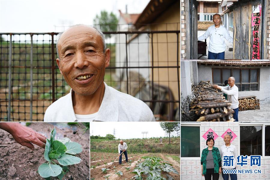 张元庆,男,1949年出生,山西省长治市沁源县棉上村人,曾任棉上村村主任、村支部书记。2012年,张元庆身患重病,在大病医疗救助制度的帮助下,巨额医药费报销比例近90%。 左上:张元庆肖像;右上:张元庆准备到后院的菜地里干活;右中:张元庆在家里摆放木柴;下右:张元庆(右)和老伴席巧珍在家中合影;下中:张元庆在地里干活;下左:张元庆在菜地里查看蔬菜生长情况(拼版照片,6月18日摄)。 地处晋东南的山西省长治市,位于由太行山、太岳山环绕而成的上党盆地中。在群山中、崖壁上,许多村庄自然条件恶劣,基础设施落后,脱贫致富是大山深处人们的迫切心愿。 近年来,一场场脱贫攻坚战,在一个个深山村打响。政府全力探索脱贫路径的同时,山区百姓因地制宜,靠自己的双手和智慧走上致富路,交出了一份扎实的脱贫答卷。 记者在太行山、太岳山一路寻访,记录下多位70岁老人的生活。这些共和国的同龄人,亲历了山乡的巨变,见证着长治山区脱贫攻坚伟大工程的一步步推进。 新华社记者 杨晨光 摄