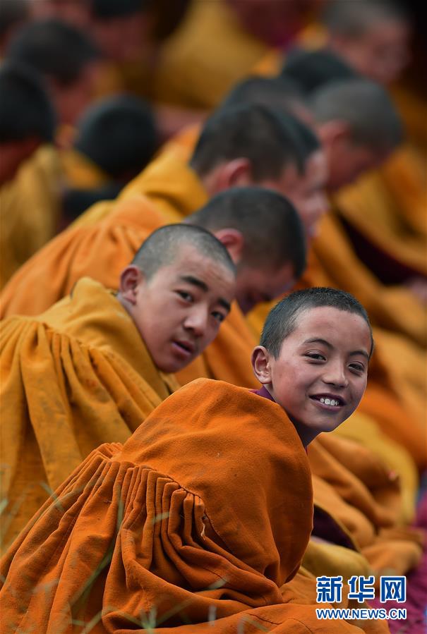 展佛法会上的僧人(7月15日摄)。 7月15日开始,西藏日喀则扎什伦布寺举行连续三天的展佛活动。第一天展出高40米、长38米的无量光佛巨幅唐卡佛像。在藏传佛教中,无量光佛被认为是“过去佛”。 新华社记者 觉果 摄