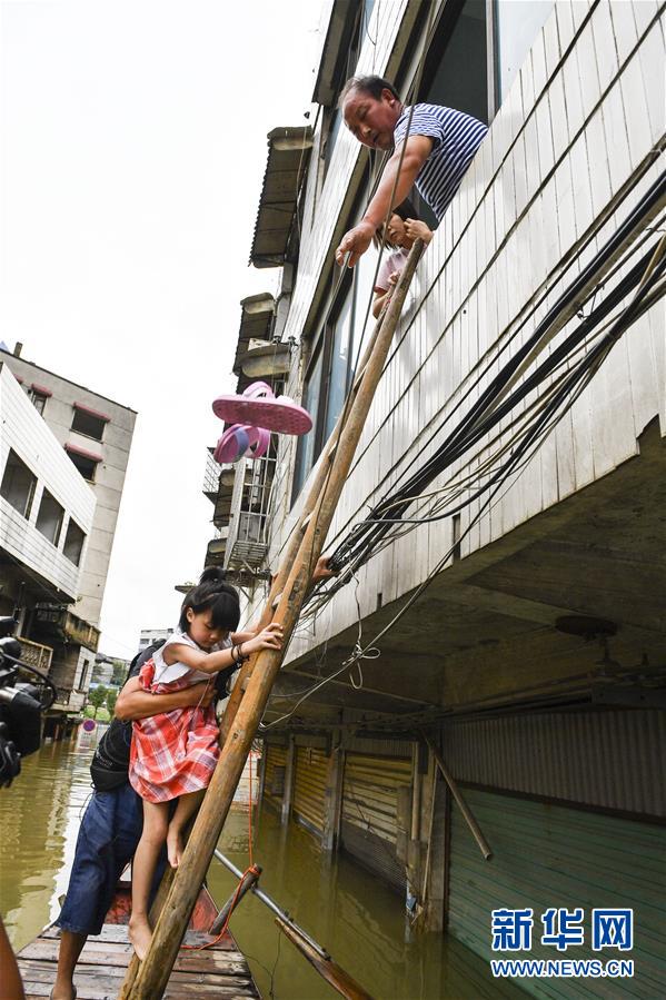 7月14日,在湖南省永州市冷水滩区杨家桥街道伍家院社区,志愿者唐新林(左一)将被积水困住的儿童转移到安全地带。 新华社发(陈思汗摄)