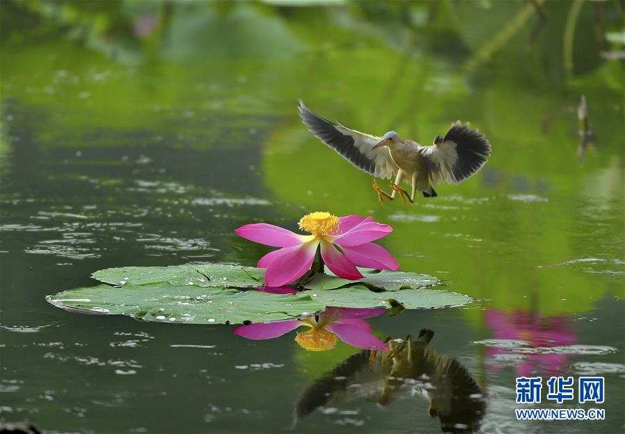 7月15日,一只水鸟在唐山市南湖公园的荷塘嬉戏。 近日,大批水鸟飞临河北省唐山市南湖公园,在荷花绽放的湖面上飞舞嬉戏,形成一道靓丽的风景线。唐山市南湖公园所在地曾是因采煤沉降而形成的废弃地,污水横流。1996年起,唐山市开始对南湖采煤沉降地进行综合治理。经过不懈努力,这里已变身为一处水域面积11.5平方公里、绿地面积16平方公里的风景区。 新华社记者杨世尧摄