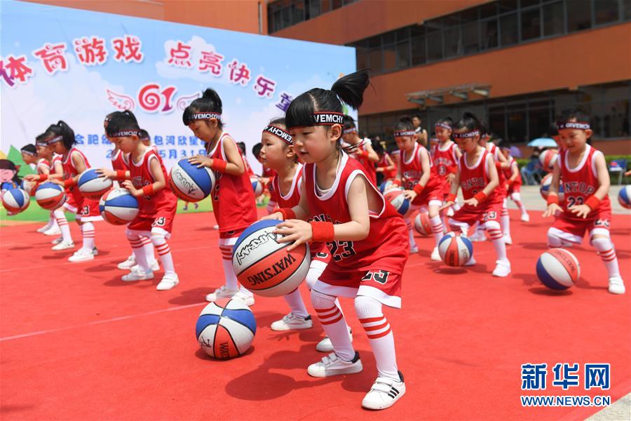 5月31日,在合肥幼教集团包河欣星幼儿园“六一”民间趣味体育游戏展演活动中,小朋友表演“花样篮球”。新华社记者 张端 摄